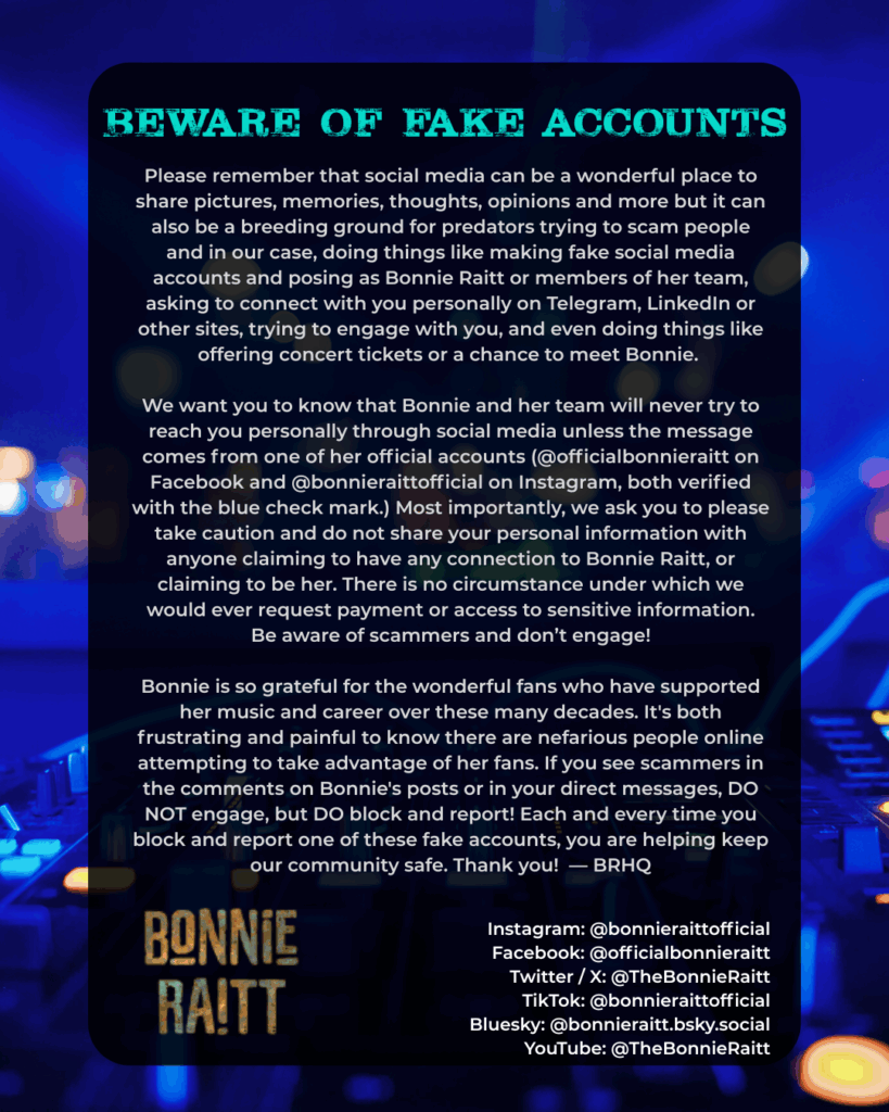Please remember that social media can be a wonderful place to share pictures, memories, thoughts, opinions and more but it can also be a breeding ground for predators trying to scam people and in our case, doing things like making fake social media accounts and posing as Bonnie Raitt or members of her team, asking to connect with you personally on Telegram, LinkedIn or other sites, trying to engage with you, and even doing things like offering concert tickets or a chance to meet Bonnie.